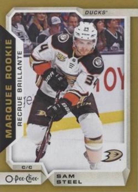 The Sam Steel 2018 Upper Deck #627 2018 O-Pee-Chee Update - Gold Rookie card is 1 of 30 Sam Steel's card variations in the 2018 Upper Deck set being tracked by Sports Card Investor, including Young Guns Base, Young Guns Canvas, Young Guns - Clear Cut, Young Guns - Jumbo, and Young Guns - Silver Foil.