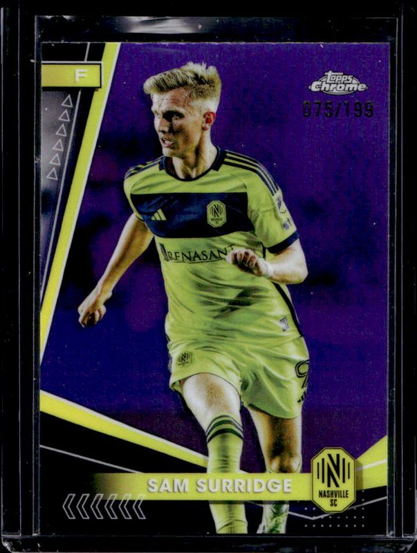 The Sam Surridge 2024 Topps Chrome MLS #118 Purple Refractor /199 card is 1 of 26 Sam Surridge's card variations in the 2024 Topps Chrome MLS set being tracked by Sports Card Investor, including Base, Aqua Lava Refractor, Gold Lava Refractor, Neon Green Lava Refractor, and Prism Refractor.