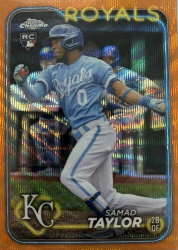 The Samad Taylor 2024 Topps Chrome #243 Orange Wave Refractor /25 Rookie card is 1 of 16 Samad Taylor's card variations in the 2024 Topps Chrome set being tracked by Sports Card Investor, including Base, Pink Refractor, Lightboard Logo Refractor, X Fractor, and Aqua Lava Refractor /199.