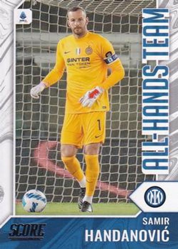 The Samir Handanovic 2021 Score Serie A #4 All Hands card is 1 of 26 Samir Handanovic's card variations in the 2021 Score Serie A set being tracked by Sports Card Investor, including Base, Red Laser, Red Lava, Orange Lava /99, and Blue Laser /49.