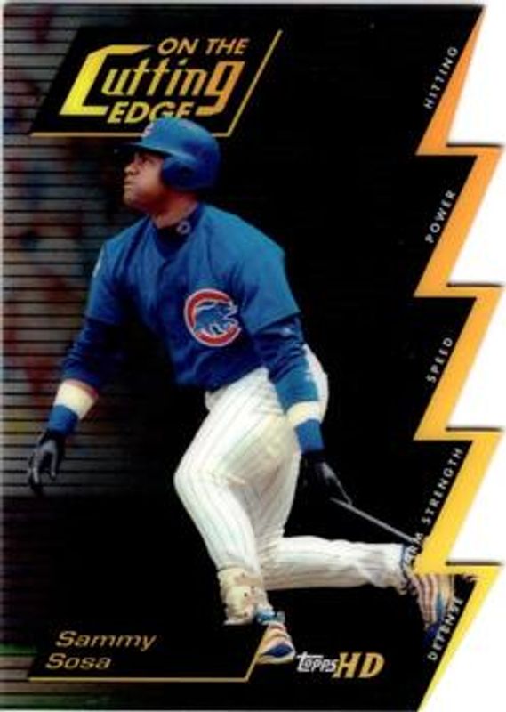 The Sammy Sosa 2000 Topps High Definition (HD) #CE8 On the Cutting Edge card is 1 of 5 Sammy Sosa's card variations in the 2000 Topps High Definition (HD) set being tracked by Sports Card Investor, including Base, Platinum, Ballpark Figures, and Image.