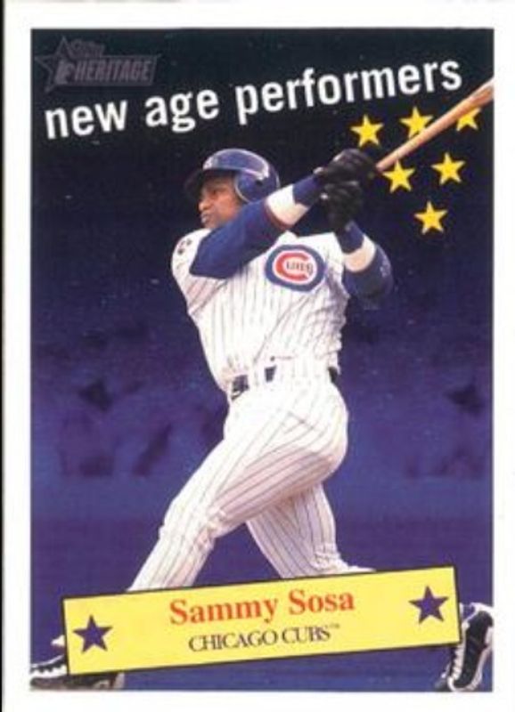 The Sammy Sosa 2001 Topps Heritage #NAP2 New Age Performers card is 1 of 4 Sammy Sosa's card variations in the 2001 Topps Heritage set being tracked by Sports Card Investor, including Base, Classic Renditions, and Chrome /552.