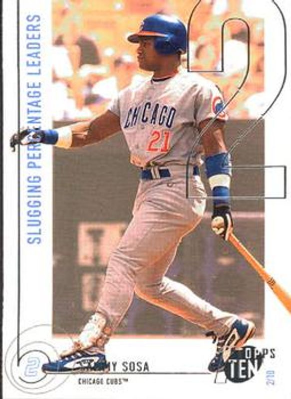 The Sammy Sosa 2002 Topps Ten #63 Base card is 1 of 10 Sammy Sosa's card variations in the 2002 Topps Ten set being tracked by Sports Card Investor, including #108 Base, #32 Base, #42 Base, #82 Base, and #108 Die-Cut.