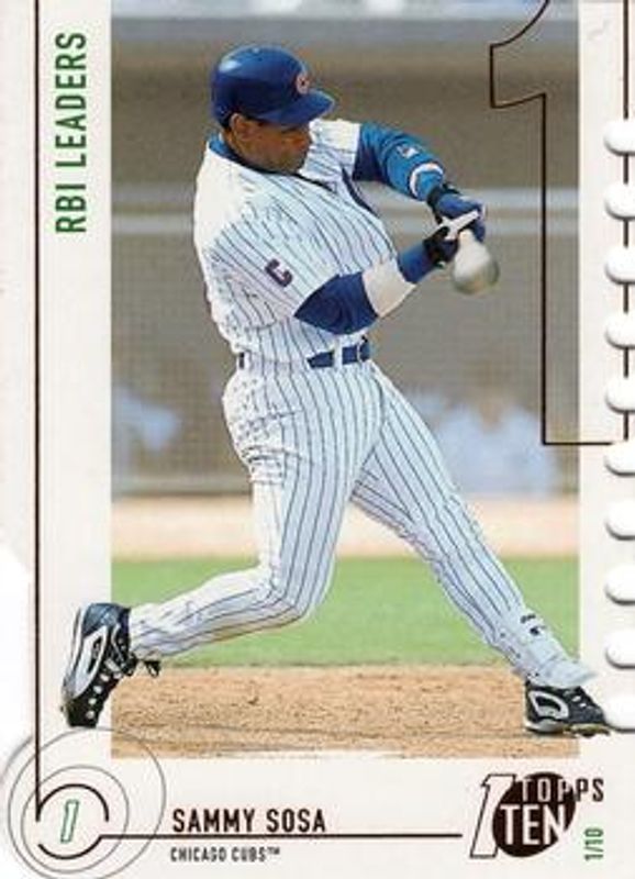 The Sammy Sosa 2002 Topps Ten #42 Die-Cut card is 1 of 10 Sammy Sosa's card variations in the 2002 Topps Ten set being tracked by Sports Card Investor, including #108 Base, #32 Base, #42 Base, #63 Base, and #82 Base.
