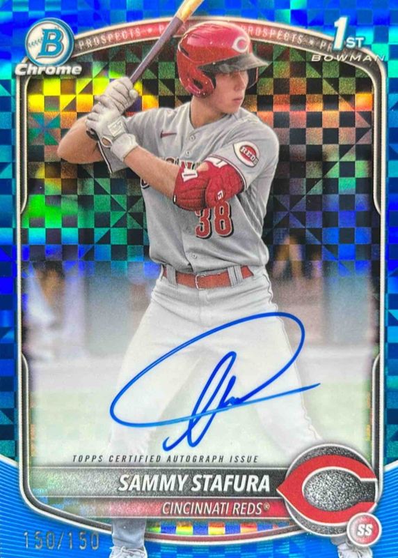 Sammy Stafura 2025 Bowman Chrome 1st Blue X-fractor Auto /150 #CPA-SS Reds