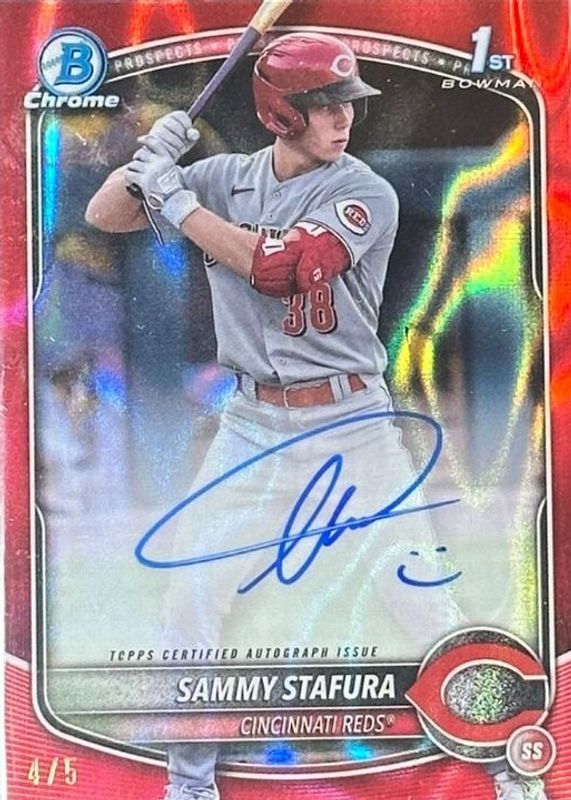 The Sammy Stafura 2025 Bowman #CPA-SS Chrome Prospect Auto - Red Lava Refractor /5 (1st) card in Raw condition has not changed in price in the last 30 days and was last sold for $370.00 .