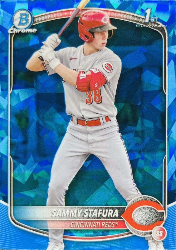 The Sammy Stafura 2025 Bowman Sapphire Edition #BCP-100 Chrome Prospects card is 1 of 16 Sammy Stafura's card variations in the 2025 Bowman Sapphire Edition set being tracked by Sports Card Investor, including Chrome Prospect Autographs /199, Chrome Prospect Autographs - Green Refractor /99, Chrome Prospects - Green Refractor /99, Chrome Prospects - Yellow Refractor /75, and Chrome Prospect Autographs - Gold Refractor /50.