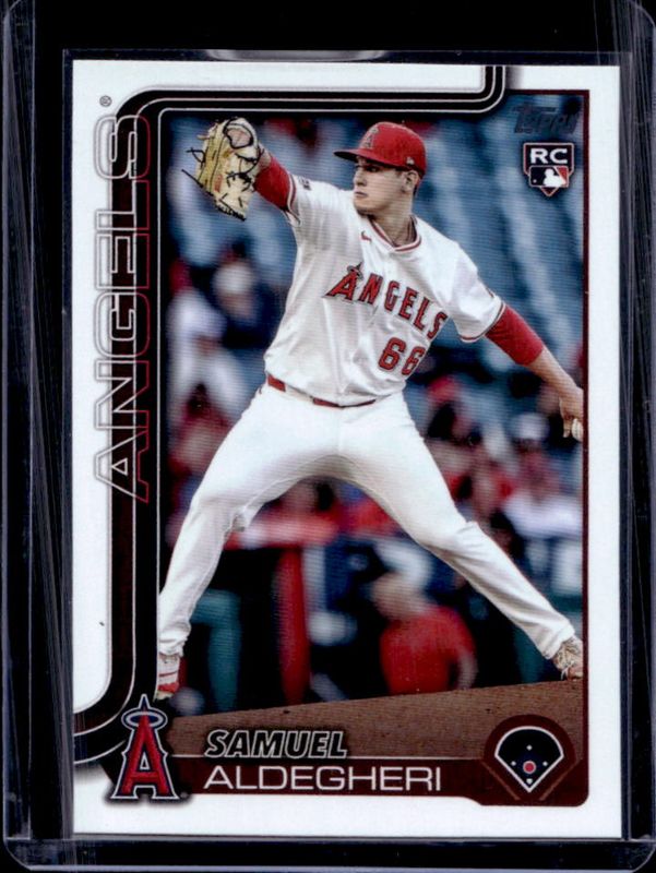 The Samuel Aldegheri 2025 Topps #438 Base Rookie card is 1 of 82 Samuel Aldegheri's card variations in the 2025 Topps set being tracked by Sports Card Investor, including Aqua Holo Foil, Diamante Foil, Holo Foil, Pink Diamante Foil, and Pink Holo Foil.