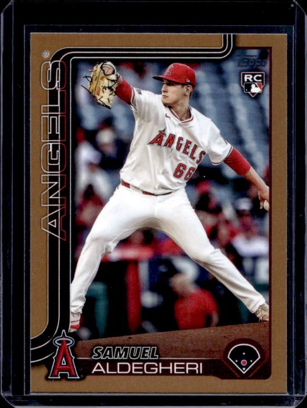 The Samuel Aldegheri 2025 Topps #438 Gold /2025 Rookie card is 1 of 82 Samuel Aldegheri's card variations in the 2025 Topps set being tracked by Sports Card Investor, including Base, Aqua Holo Foil, Diamante Foil, Holo Foil, and Pink Diamante Foil.