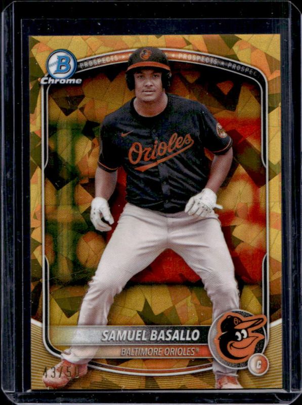 The Samuel Basallo 2025 Bowman Sapphire Edition #BCP-109 Chrome Prospects - Gold Refractor /50 card is 1 of 14 Samuel Basallo's card variations in the 2025 Bowman Sapphire Edition set being tracked by Sports Card Investor, including Chrome Prospects, Sapphire Selections, Chrome Prospects - Green Refractor /99, Chrome Prospects - Yellow Refractor /75, and Sapphire Selections - Gold Refractor /50.