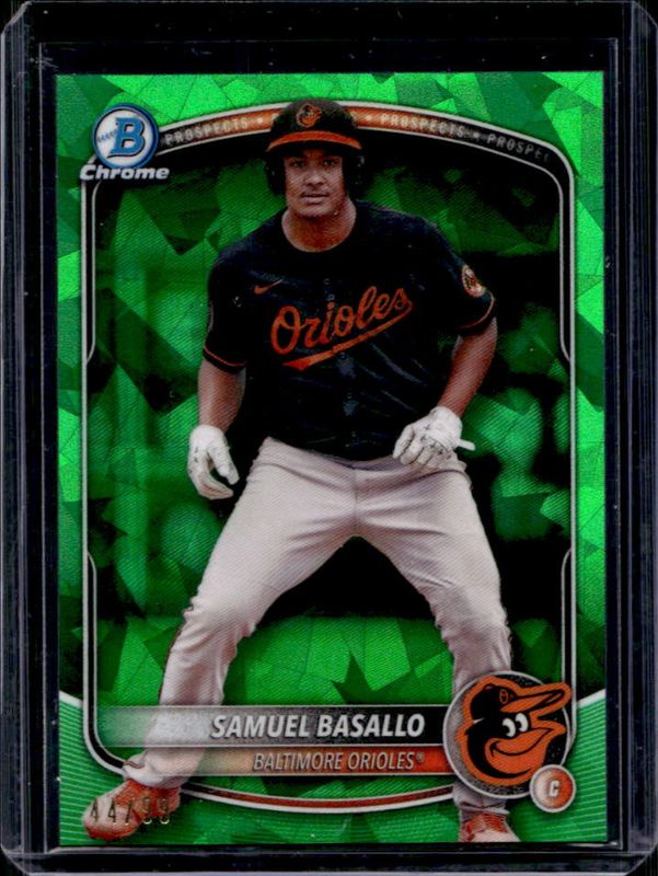 The Samuel Basallo 2025 Bowman Sapphire Edition #BCP-109 Chrome Prospects - Green Refractor /99 card is 1 of 14 Samuel Basallo's card variations in the 2025 Bowman Sapphire Edition set being tracked by Sports Card Investor, including Chrome Prospects, Sapphire Selections, Chrome Prospects - Yellow Refractor /75, Chrome Prospects - Gold Refractor /50, and Sapphire Selections - Gold Refractor /50.