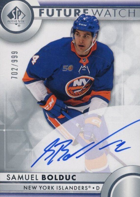 This card is 1 of 3 Samuel Bolduc's card variations in the 2023 SP Authentic set being tracked by Sports Card Investor, including Future Watch Auto - Mystery Black, and Future Watch Auto - Inscriptions /50.