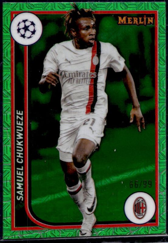 The Samuel Chukwueze 2023 Topps Merlin Chrome UEFA Club Competitions #3 Green Mojo Refractor /99 card is 1 of 25 Samuel Chukwueze's card variations in the 2023 Topps Merlin Chrome UEFA Club Competitions set being tracked by Sports Card Investor, including Base, Aqua Prism Refractor, Refractor, Vintage Merlin Refractor, and Neon Green Shimmer Refractor /399.