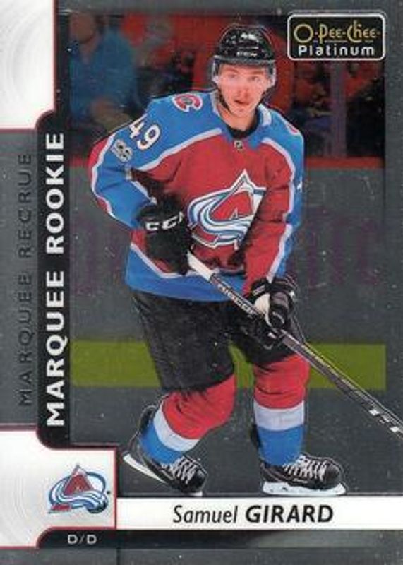 The Samuel Girard 2017 O-Pee-Chee Platinum #164 Base Rookie card is 1 of 14 Samuel Girard's card variations in the 2017 O-Pee-Chee Platinum set being tracked by Sports Card Investor, including Rainbow, Violet Pixels, Red Prism /199, Royal Blue Cubes /99, and Seismic Gold /50.