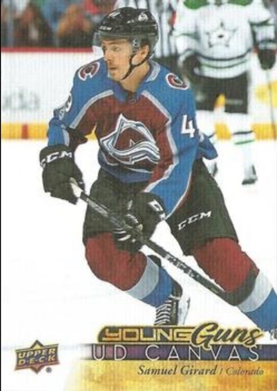 The Samuel Girard 2017 Upper Deck #C239 Young Guns Canvas Rookie card is 1 of 26 Samuel Girard's card variations in the 2017 Upper Deck set being tracked by Sports Card Investor, including Young Guns Base, Gold Rainbow Foil, Silver Foil, Young Guns - Clear Cut, and Young Guns - Gold Rainbow Foil.