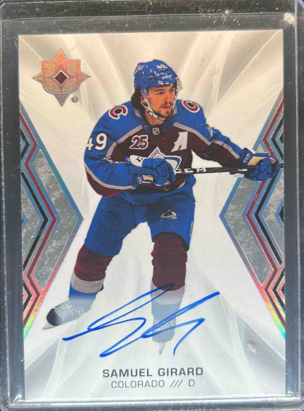 The Samuel Girard 2021 Upper Deck Ultimate Collection #54 Autographs card is 1 of 15 Samuel Girard's card variations in the 2021 Upper Deck Ultimate Collection set being tracked by Sports Card Investor, including Base /299, Gold /35, Purple /15, Black /5, and 2000 Ultimate Signatures Retro.