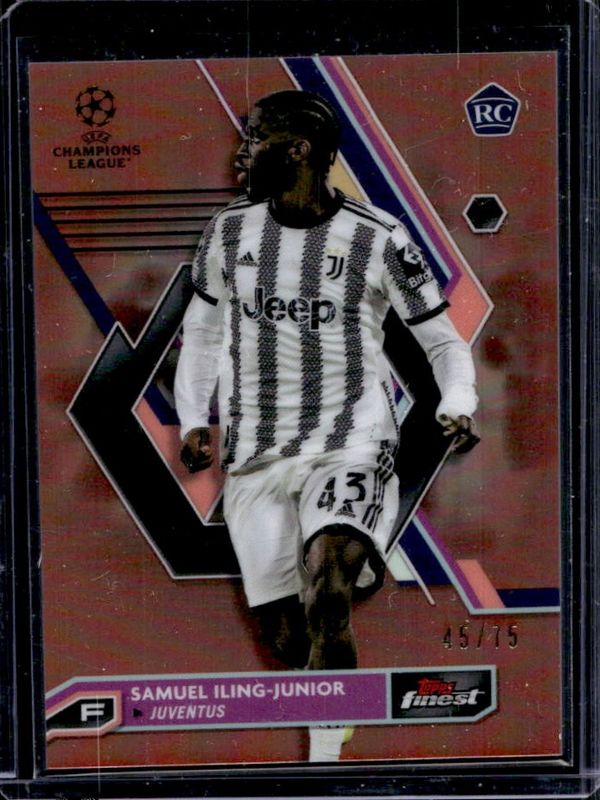 The Samuel Iling-Junior 2022 Topps Finest UEFA Club Competitions #58 Rose Gold Refractor /75 Rookie card is 1 of 18 Samuel Iling-Junior's card variations in the 2022 Topps Finest UEFA Club Competitions set being tracked by Sports Card Investor, including Base, Refractor, Purple Refractor /299, Sky Blue Refractor /275, and Blue Aqua Vapor Wave Refractor /250.