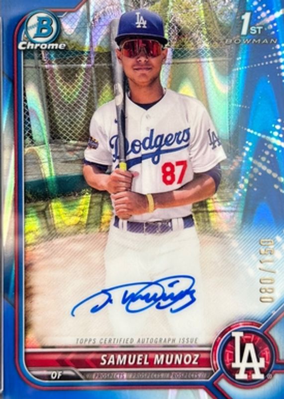 Best Prices Available For Sale of Samuel Munoz 2022 Bowman Chrome #CPA-SM Prospect Auto - Blue RayWave Refractor /150 (1st)
