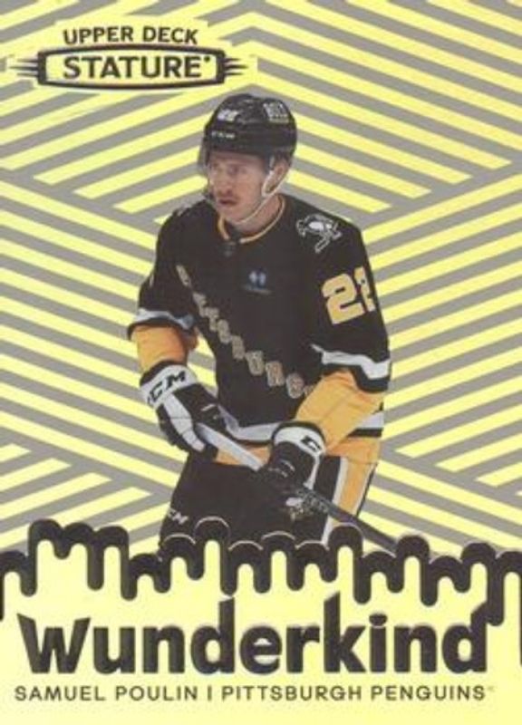 The Samuel Poulin 2022 Upper Deck Stature #W-42 Wunderkind Rookie card is 1 of 48 Samuel Poulin's card variations in the 2022 Upper Deck Stature set being tracked by Sports Card Investor, including Base /399, Green /99, Photo Variant /99, Red /75, and Photo Variant Green /66.