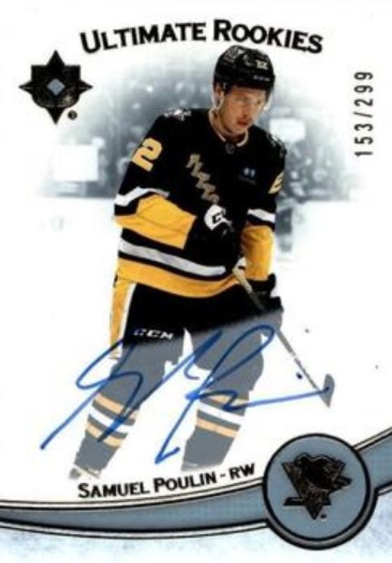 The Samuel Poulin 2022 Upper Deck Ultimate Collection #172 Base /299 Rookie card is 1 of 20 Samuel Poulin's card variations in the 2022 Upper Deck Ultimate Collection set being tracked by Sports Card Investor, including Ultimate Rookies Jersey /799, Ultimate Rookies Patch Auto /99, Jumbo Patch Auto /3, Shield Patch Auto /1, and 1999 Ultimate Victory Retro Rookie Autographs.