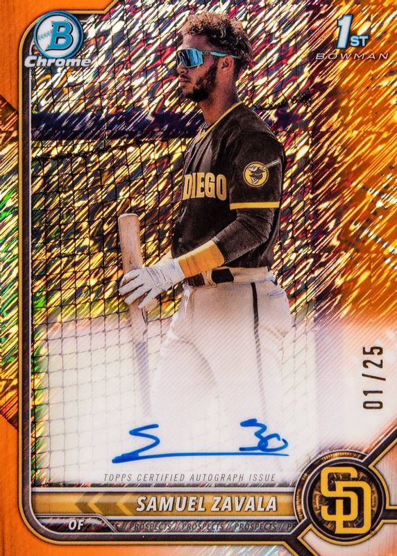 Auctions Ending Soon for Samuel Zavala 2022 Bowman Chrome #CPA-SZ Prospect Auto - Orange Shimmer Refractor /25 (1st) RAW