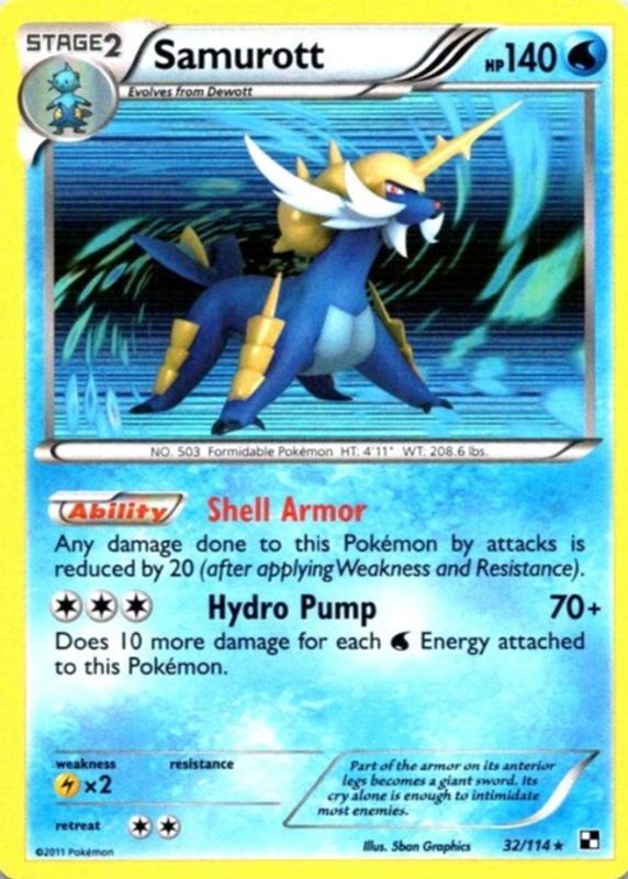 The Samurott 2011 Black & White #032/114 Holo card in Raw TCG (Near Mint) condition has not changed in price in the last 30 days and was last sold for $3.49 .