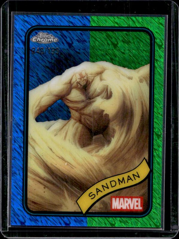 The Sandman 2025 Topps Chrome #91 Blue & Green Shimmer Refractor /199 card is 1 of 23 Sandman's card variations in the 2025 Topps Chrome set being tracked by Sports Card Investor, including Base, Refractor, Yellow Lava Refractor, Spider Web Refractor /399, and Blue Refractor /299.