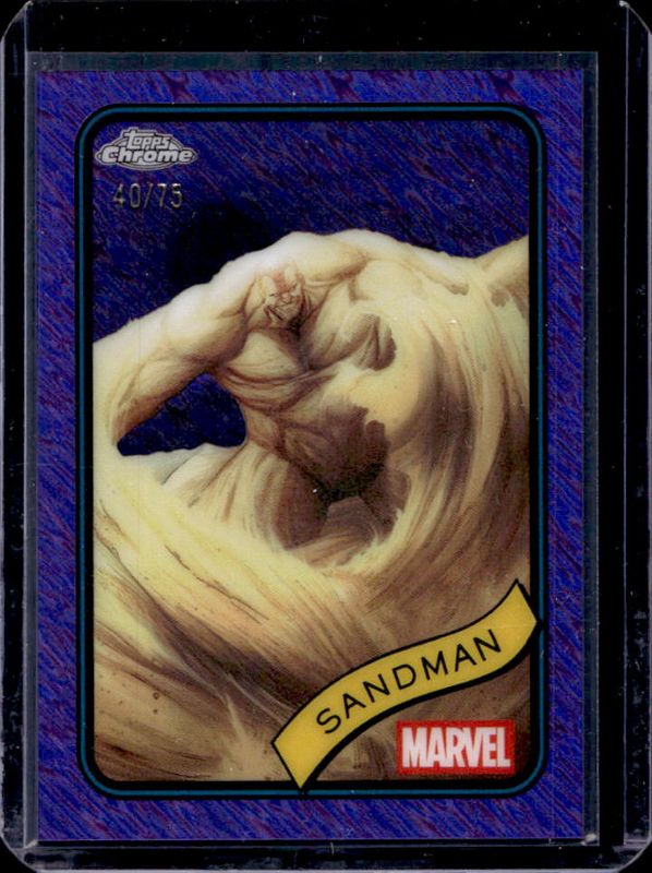 The Sandman 2025 Topps Chrome #91 Purple Shimmer Refractor /75 card is 1 of 23 Sandman's card variations in the 2025 Topps Chrome set being tracked by Sports Card Investor, including Base, Refractor, Yellow Lava Refractor, Spider Web Refractor /399, and Blue Refractor /299.