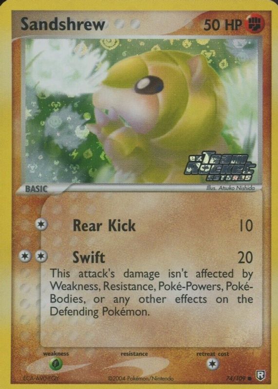 The Sandshrew 2004 EX: Team Rocket Returns #074/109 Reverse Holo card in Raw TCG (Near Mint) condition has not changed in price in the last 30 days and was last sold for $28.00 .