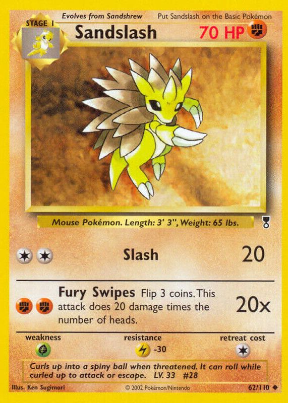 The Sandslash 2002 Legendary Collection #62 Base card in Raw TCG (Near Mint) condition has moved down -$2.11 (-56.3%) in the last 30 days and was last sold for $1.64 .