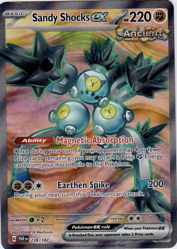 The Sandy Shocks ex 2023 Scarlet & Violet: Paradox Rift #228/182 Ultra Rare card in Raw TCG (Near Mint) condition has moved up $0.15 (+5.1%) in the last 30 days and was last sold for $2.99 .
