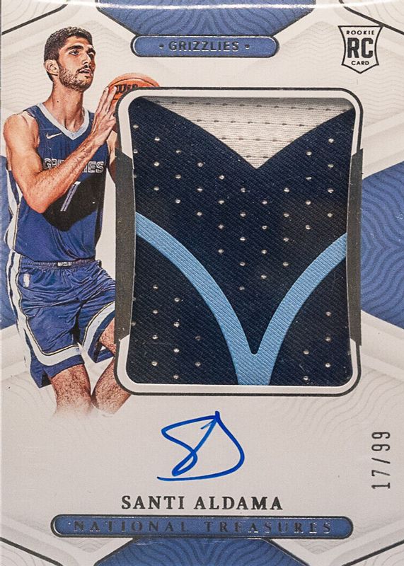 The Santi Aldama 2021 National Treasures #122 Rookie Patch Auto /99 card in Raw condition has moved up $125 (+125%) in the last 30 days and was last sold for $224.50 .