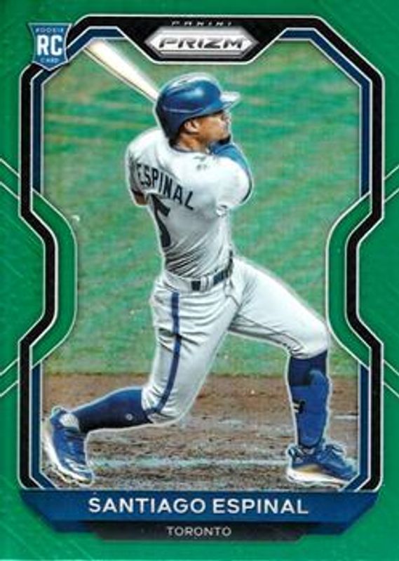The Santiago Espinal 2021 Prizm #72 Green Rookie card is 1 of 68 Santiago Espinal's card variations in the 2021 Prizm set being tracked by Sports Card Investor, including Base, Blue, Blue Velocity, Carolina Blue, and Cosmic Haze.