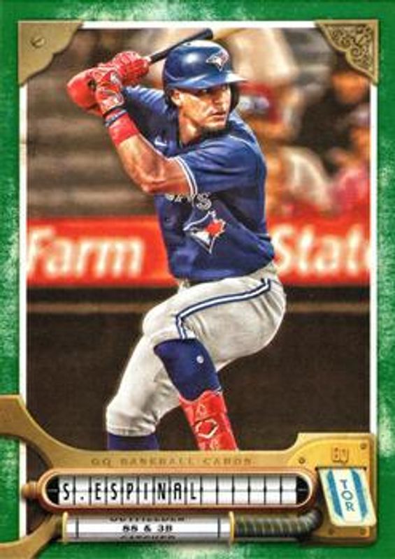 The Santiago Espinal 2022 Topps Gypsy Queen #159 Green card is 1 of 14 Santiago Espinal's card variations in the 2022 Topps Gypsy Queen set being tracked by Sports Card Investor, including Base, Missing Black Plate, Missing Nameplate, Team Logo Swap, and Burnt Umber /399.