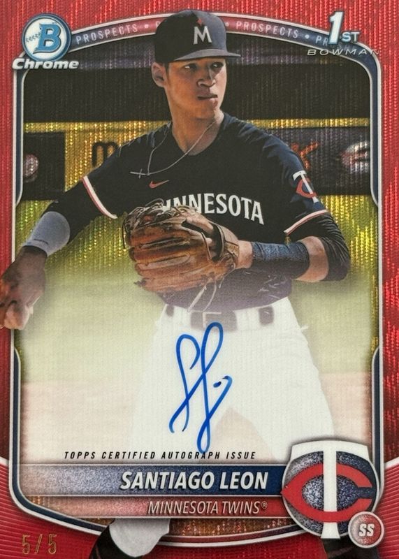 The Santiago Leon 2025 Bowman Chrome #CPA-SL Prospect Auto - Red Wave Refractor /5 (1st) card in Raw condition has not changed in price in the last 30 days and was last sold for $153.50 .
