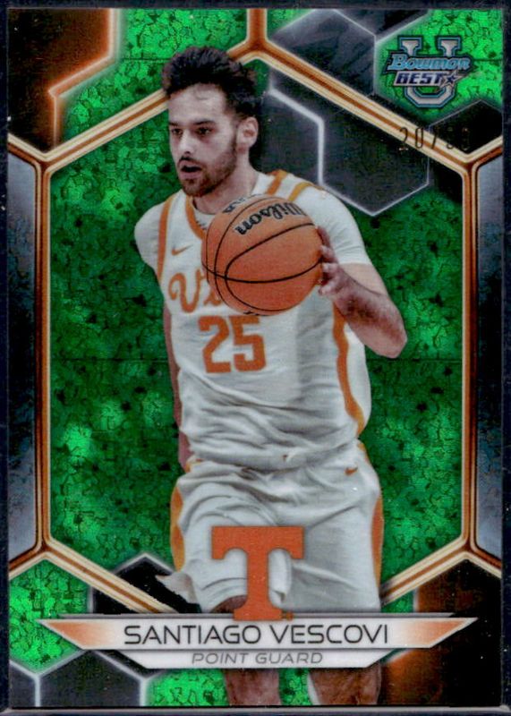 The Santiago Vescovi 2023 Bowman Best University #82 Green Mini-Diamond Refractor /99 card is 1 of 27 Santiago Vescovi's card variations in the 2023 Bowman Best University set being tracked by Sports Card Investor, including Base, Refractor, Speckle Refractor, Blue Refractor /150, and Pink Lava Refractor /100.
