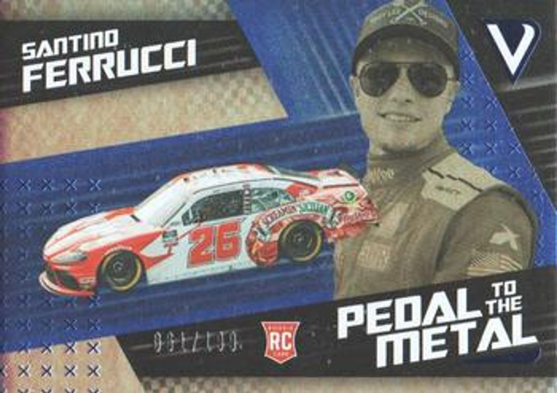 The Santino Ferrucci 2022 Chronicles NASCAR #14 Pedal to the Metal Blue /199 card is 1 of 66 Santino Ferrucci's card variations in the 2022 Chronicles NASCAR set being tracked by Sports Card Investor, including Clearly Donruss, Clear Vision, Magnitude, Obsidian, and Obsidian Signatures.