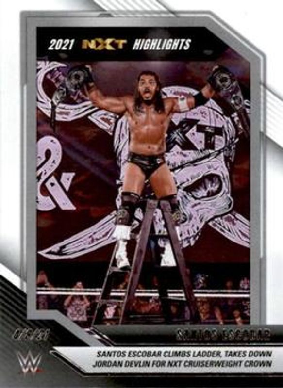 The Santos Escobar 2022 Panini WWE NXT #12 2021 NXT Highlights card is 1 of 51 Santos Escobar's card variations in the 2022 Panini WWE NXT set being tracked by Sports Card Investor, including Base, Green, Silver, Red /199, and Blue /149.