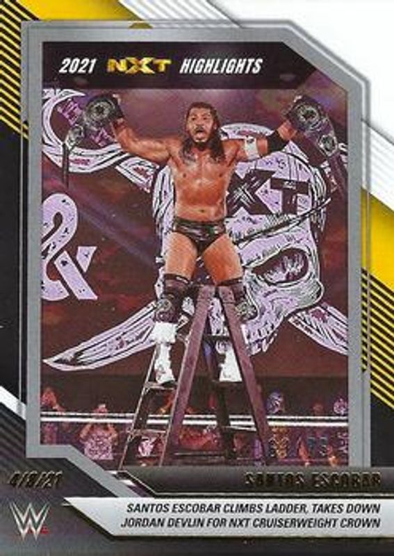 The Santos Escobar 2022 Panini WWE NXT #12 2021 NXT Highlights - Black & Gold /75 card is 1 of 51 Santos Escobar's card variations in the 2022 Panini WWE NXT set being tracked by Sports Card Investor, including Base, Green, Silver, Red /199, and Blue /149.