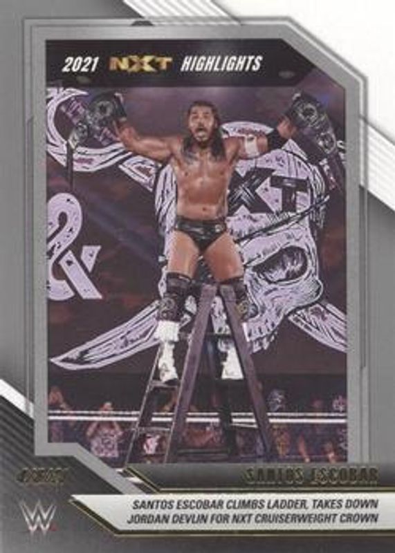 The Santos Escobar 2022 Panini WWE NXT #12 2021 NXT Highlights - Silver card is 1 of 51 Santos Escobar's card variations in the 2022 Panini WWE NXT set being tracked by Sports Card Investor, including Base, Green, Silver, Red /199, and Blue /149.