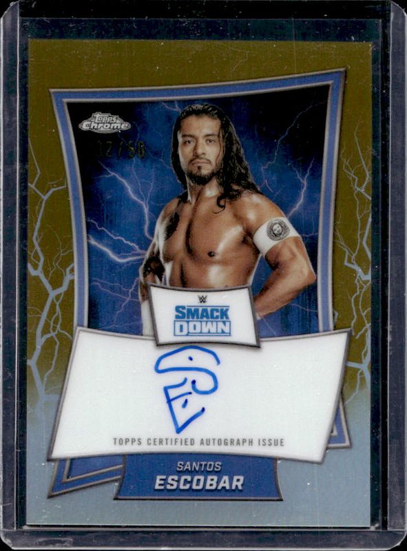 The Santos Escobar 2025 Topps Chrome WWE #BBA-SAN Blue Brand Autographs - Gold Refractor /50 card is 1 of 61 Santos Escobar's card variations in the 2025 Topps Chrome WWE set being tracked by Sports Card Investor, including Base, Black & Gold Refractor, Geometric Refractor, Neon Green & Black Refractor, and Pink Shimmer Refractor.