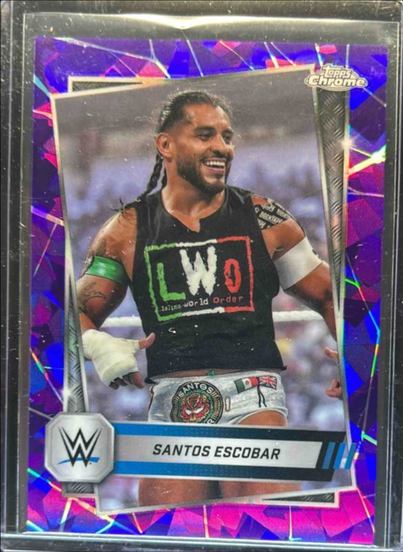 The Santos Escobar 2025 Topps Chrome WWE Sapphire Edition #60 Base Chrome - Purple Refractor /10 card is 1 of 11 Santos Escobar's card variations in the 2025 Topps Chrome WWE Sapphire Edition set being tracked by Sports Card Investor, including Base Chrome, Blue Brand Autographs, Base Chrome - Green Refractor /75, Base Chrome - Gold Refractor /50, and Base Chrome - Orange Refractor /25.