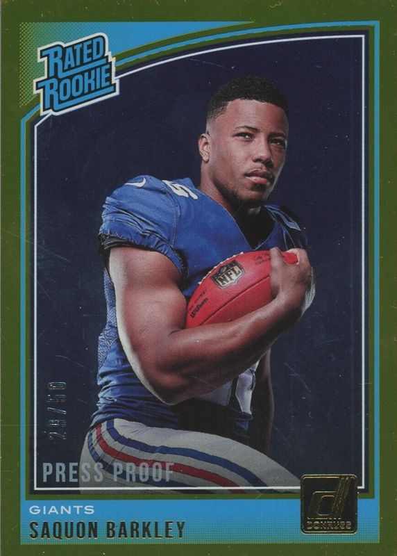 This card is 1 of 48 Saquon Barkley's card variations in the 2018 Donruss set being tracked by Sports Card Investor, including Base, Aqueous Test, Jersey Number (/26), Press Proof Blue, and Press Proof Green.