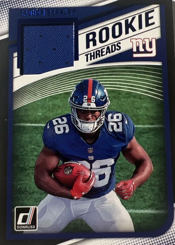 The Saquon Barkley 2018 Donruss #6 Rookie Threads - Blue card in Raw condition has not changed in price in the last 30 days and was last sold for $4.25 .