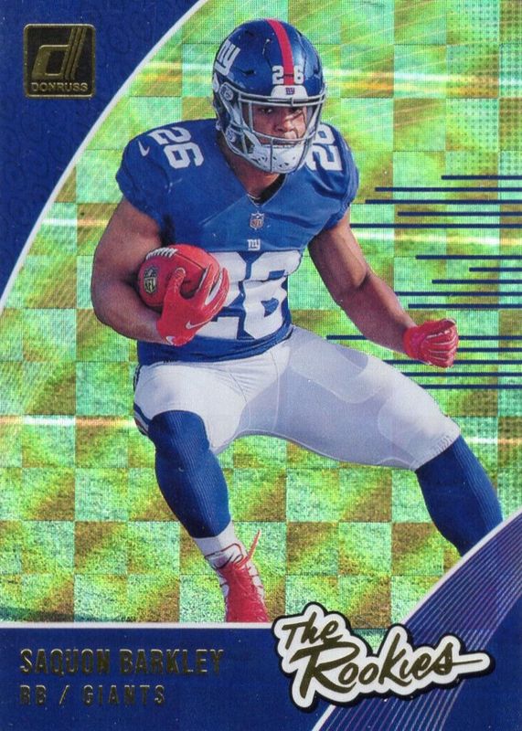 This card is 1 of 48 Saquon Barkley's card variations in the 2018 Donruss set being tracked by Sports Card Investor, including Base, Aqueous Test, Jersey Number (/26), Press Proof Blue, and Press Proof Green.