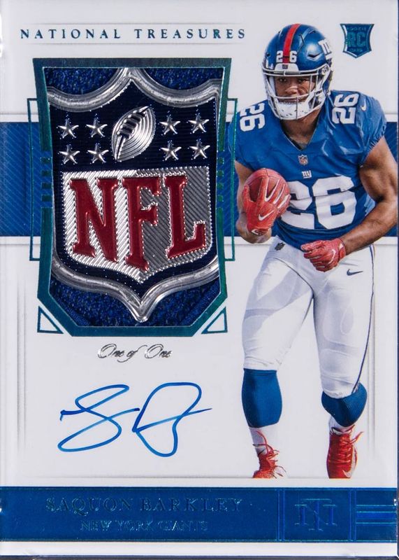Saquon Barkley 2018 National Treasures #169 Rookie Patch Auto - Platinum NFL Shield /1 RAW Price Guide