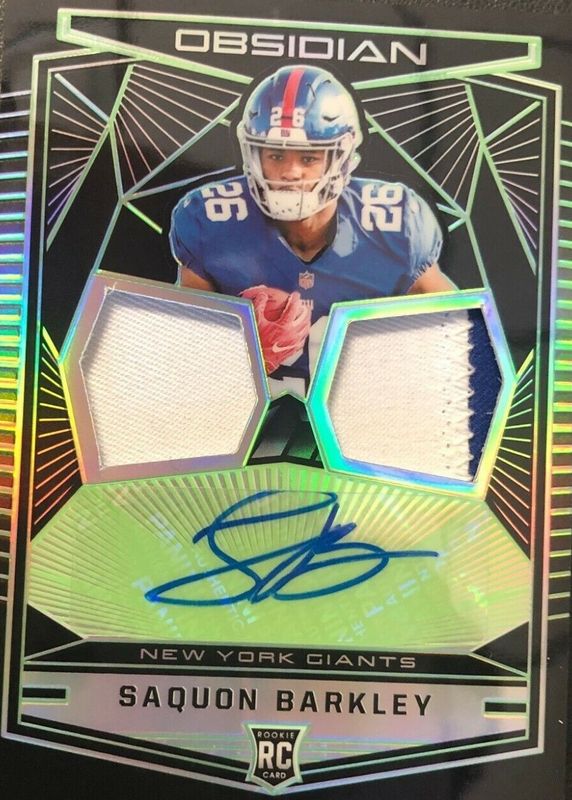 The Saquon Barkley 2018 Obsidian #RJ-SB Rookie Jersey Autographs - Electric Etch Green /25 card in Raw condition has not changed in price in the last 30 days and was last sold for $192.50 .