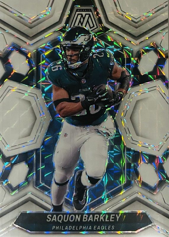 This card is 1 of 25 Saquon Barkley's card variations in the 2024 Mosaic set being tracked by Sports Card Investor, including Choice Peacock /(SSP), Genesis /(SSP), Honeycomb /(SSP), Red Sparkle /(SSP), and White Sparkle /(SSP).