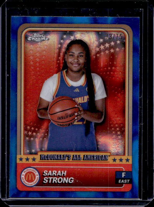 The Sarah Strong 2024 Topps Chrome McDonald's All-American #60 Blue Lava Refractor /75 card is 1 of 112 Sarah Strong's card variations in the 2024 Topps Chrome McDonald's All-American set being tracked by Sports Card Investor, including #60 Base, #10 Base, #10 Blue RayWave Refractor, #60 Blue RayWave Refractor, and #10 McDonald's Logo Refractor.