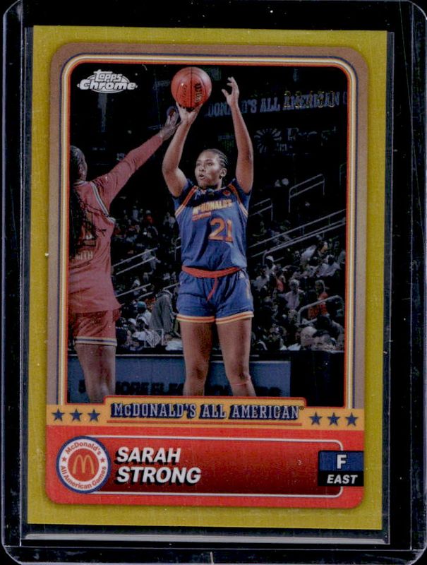 The Sarah Strong 2024 Topps Chrome McDonald's All-American #10 Gold Refractor /50 card is 1 of 112 Sarah Strong's card variations in the 2024 Topps Chrome McDonald's All-American set being tracked by Sports Card Investor, including #60 Base, #10 Base, #10 Blue RayWave Refractor, #60 Blue RayWave Refractor, and #10 McDonald's Logo Refractor.